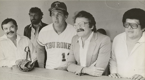 Fotorreportero Vicente Correale para el diario El Universal durante un juego en el Estadio Universitario. El campocorto David Concepción, ligado siempre a Los Tigres de Aragua aun cuando cargue aquí una franela de los Tiburones, Teodoro Petkoff, Eleazar Díaz Rangel, Víctor Rodríguez Coa. Al fondo, Yanis Chimaras.