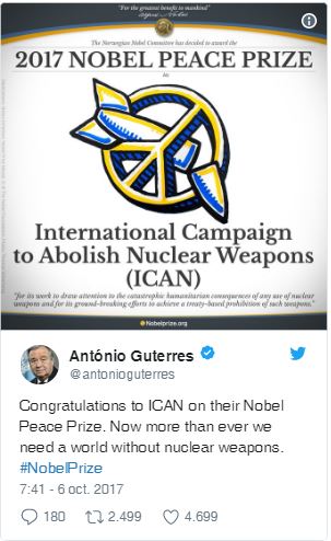 El secretario general de la ONU, el portugués António Guterres, celebró la decisión del Nobel. “Ahora más que nunca necesitamos un mundo sin armas nucleares”, afirmó en Twitter.
